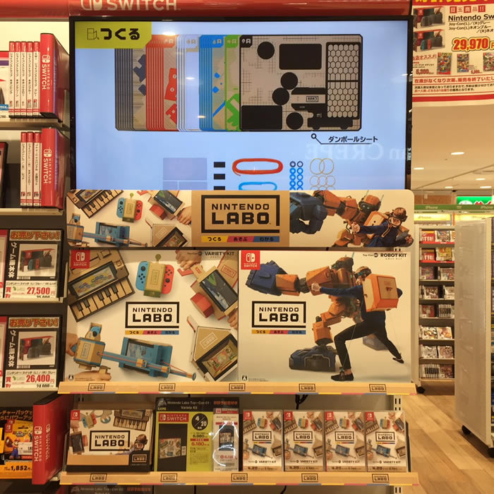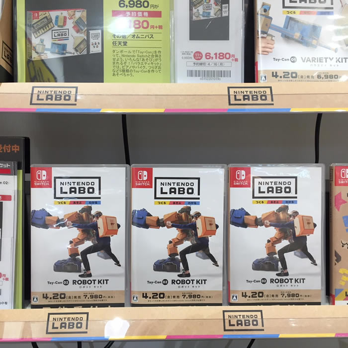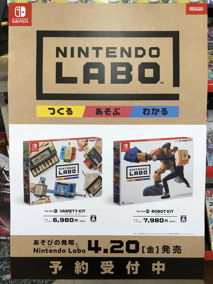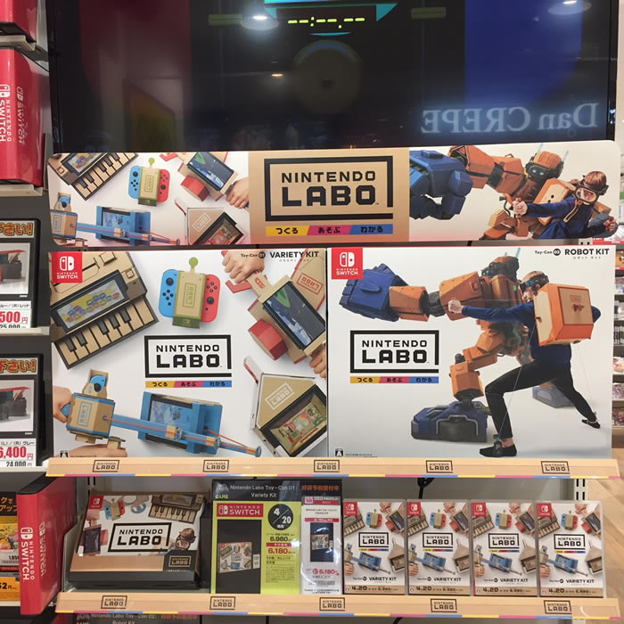 Nintendo Labo เป็นของเล่นที่ออกแบบมาให้เล่นร่วมกับเกมคอนโซล Nintendo Switch โดยมีให้เลือกหลากหลายรูปแบบ แต่ละแบบจะใช้กระดาษลังเป็นวัสดุหลัก เพื่อให้ลูกค้านำไปซื้อและสร้างเป็นของเล่นด้วยตัวเอง ในรูปแบบ DIY โดย Nintendo ได้ประกาศไว้ในวันเปิดตัวว่า จะพร้อมวางจำหน่ายอย่างทางการในวันที่ 20 เมษายน 2018 (สำหรับสหรัฐอเมริกา) แต่ล่าสุดพบว่า ร้านค้าปลีกบางแห่งในประเทศญี่ปุ่น เปิดรับจองแล้ว พร้อมนำกล่องสินค้าอวดโฉมบนชั้นวาง
