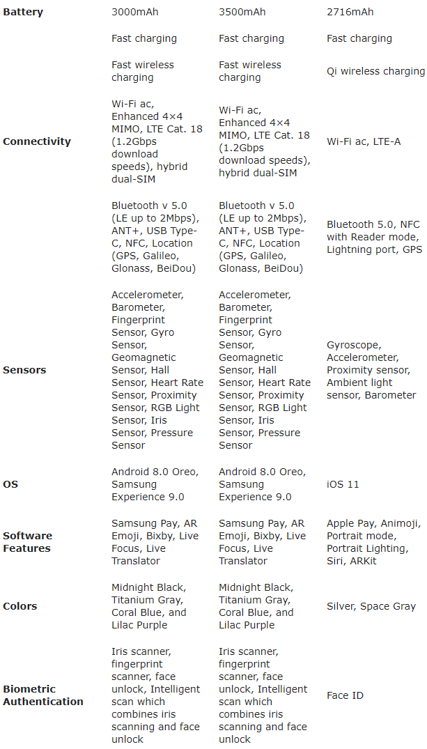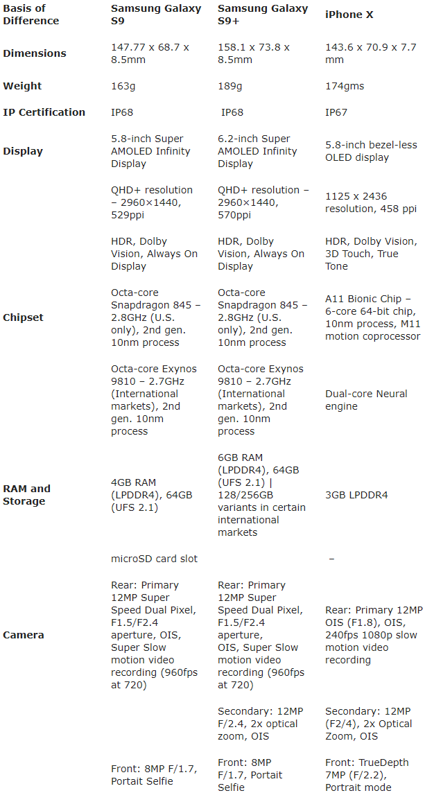 Samsung Galaxy S9 vs iPhone X Specs Comparison