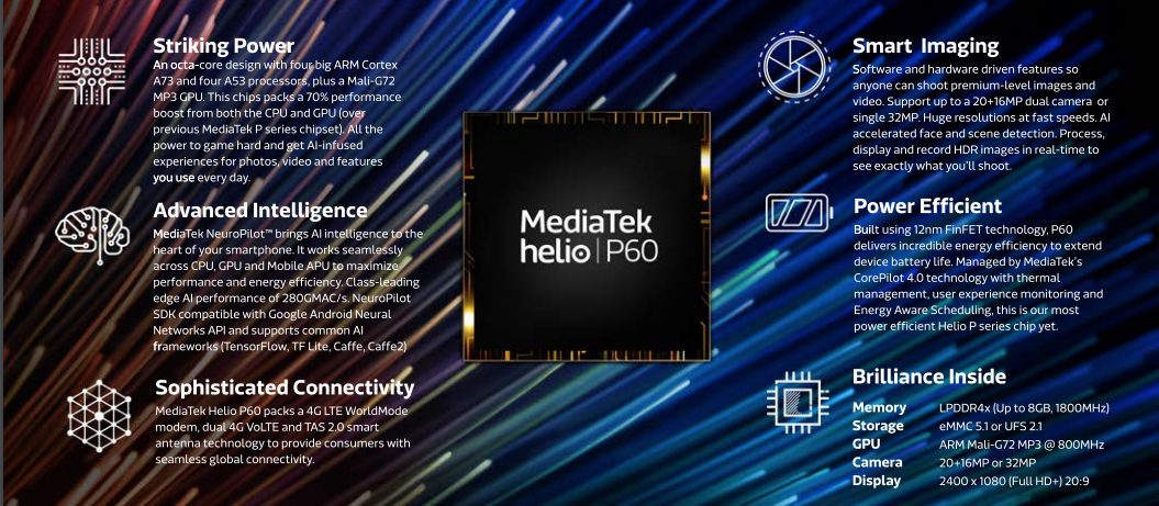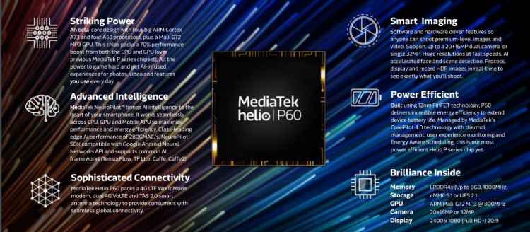 MediaTek Helio P60 มาพร้อมกับหน่วยประมวลผล Arm A73 2.0 GHz 4 ตัว และหน่วยประมวลผล Arm A53 2.0 GHz อีก 4 ตัวในโครงแบบ big.LITTLE ระดับ octa-core ระบบบนชิป (SoC) ตัวนี้ผลิตขึ้นจากกระบวนการการผลิตแบบ TSMC 12nm และเป็นระบบ SoC ที่ใช้พลังงานอย่างมีประสิทธิภาพที่สุดในตระกูล Helio P ของ Mediatek โดยเมื่อเทียบกับผลิตภัณฑ์ตระกูล Helio P รุ่นก่อนหน้าอย่าง Helio P23 แล้ว MediaTek Helio P60 ให้ประสิทธิภาพโดยรวมดีขึ้น 12% และมีประสิทธิภาพในด้านการใช้พลังงานมากขึ้นถึง 25% โดยเฉพาะอย่างยิ่งในระหว่างการเล่นเกมที่ต้องใช้สมรรถนะสูง ทำให้ผู้บริโภคเล่นเกมบนอุปกรณ์ได้นานยิ่งขึ้น ชิปเซ็ตนี้ใช้เทคโนโลยี CorePilot 4.0 ของ Mediatek ที่มาพร้อมกับฟังก์ชั่นควบคุมดูแลความร้อน ติดตามประสบการณ์ของผู้ใช้ และฟังก์ชั่น Energy Aware Scheduling (EAS) ส่งผลให้ตัวชิปเซ็ตสามารถปรับสมรรถนะและการรักษาพลังงานของหน่วยประมวลผลให้เหมาะสม เพื่อให้ผู้ใช้มีประสบการณ์การใช้งานอย่างยั่งยืน แม้จะต้องใช้งานที่อาศัยระบบประมวลผลอย่างหนักก็ตาม