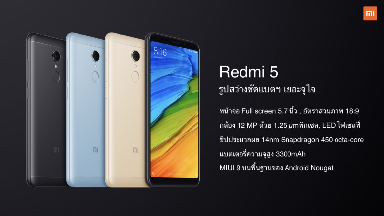 Xiaomi Redmi 5 และ Redmi 5 Plus เปิดตัวครั้งแรกในเดือนธันวาคม 2017 และวันนี้พร้อมแล้วสำหรับการทำตลาดในประเทศไทย โดยมีจุดเด่นที่การออกแบบไร้ปุ่มโฮม ใช้จอแสดงผล FullView Display ที่มีอัตราส่วนภาพ 18:9 บอดี้โค้งมน ผิวสัมผัสโลหะ ป้องกันรอยเหงื่อและลายนิ้วมือ มาพร้อมกล้องดิจิตอล 12 ล้านพิกเซล ขนาดพิกเซล 1.25 ไมครอน กล้องเซลฟี่ 5 ล้านพิกเซล พร้อมแฟลช LED มีให้เลือก 3 สี คือ สีเทาเข้ม สีทองแชมเปญ และ สีฟ้าน้ำทะเล