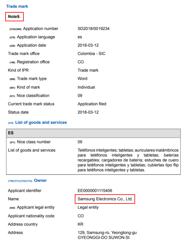 หากพิจารณาจากหมายเลขรุ่น ก็มีความเป็นไปได้สูงที่ Galaxy Note series ในปีนี้จะถูกเรียกว่า Galaxy Note 9 หลังจาก Samsung เปิดตัว Galaxy S9 เมื่อปลายเดือนกุมภาพันธ์ที่ผ่านมา และรายงานล่าสุดได้ตอกย้ำว่า Samsung จะใช้ชื่อ Galaxy Note 9 อย่างแน่นอน เพราะมีการจดเครื่องหมายการค้าแล้วในประเทศโคลอมเบีย ตามรายงานของเว็บไซต์ Galaxyclub.nl