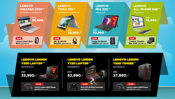 • รับฟรี Xbox 360 Wireless Controller มูลค่า 2,690 บาท เมื่อซื้อ Lenovo Legion Y720 Laptop* ตอบโจทย์คอเกมกับโน๊คบุ๊คเกมมิ่งระบบปฏิบัติการ Windows รุ่นแรกของโลกที่มาพร้อมระบบเสียงแบบ Dolby Atmos กราฟฟิกภาพคมชัดระดับ HD รองรับ VR technology ให้การเล่นเสมือนจริง สามารถใช้งานกับจอยควบคุมแบบไร้สาย Xbox One