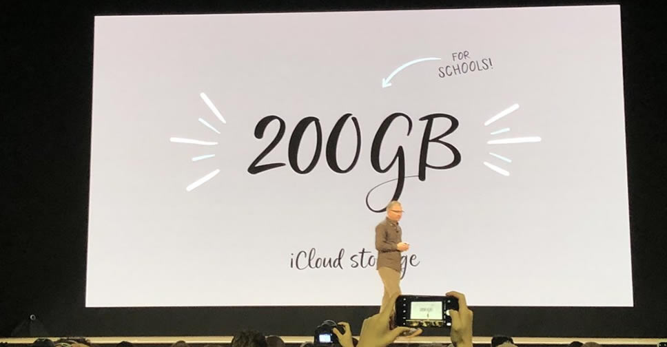 ระหว่างกิจกรรมด้านการศึกษาที่ Apple เป็นเจ้าภาพจัดงานขึ้นในเมืองชิคาโก Apple ได้ประกาศเพิ่มพื้นที่ฟรี!! บน iCloud จากเดิม 5GB เป็น 200GB แต่ใช้ได้กับบัญชี Apple ID ของนักเรียนหรือนักศึกษา ที่จัดการโดยโรงเรียนหรือสถานศึกษาเท่านั้น