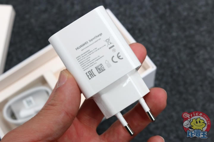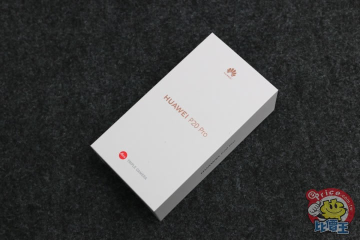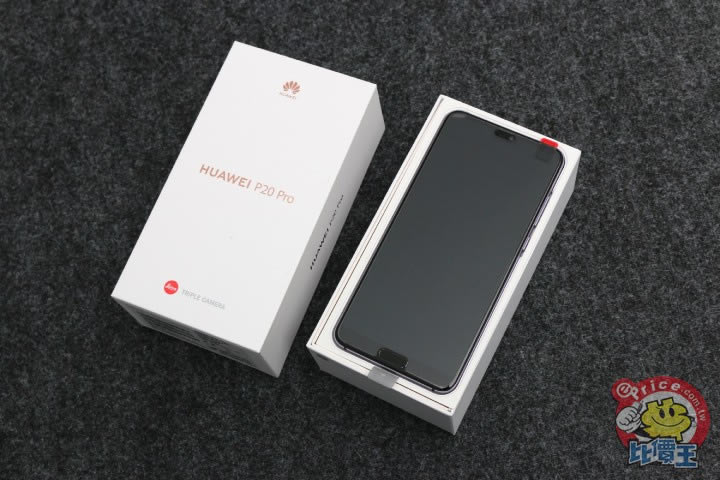 เมื่อเปิดกล่องจะพบกับ HUAWEI P20 Pro เป็นอย่างแรก เมื่อยกสมาร์ทโฟนออกไปสิ่งแรกที่พบคือ เข็มจิ้มถาดใส่ซิมการ์ด ชั้นล่างมีสายเคเบิล USB-C, อุปกรณ์ชาร์จแบตเตอรี่ รองรับเทคโนโลยีชาร์จเร็ว SuperCharge, หูฟังที่เป็นพอร์ต USB-C, Adapter แปลงพอร์ต USB-C เป็นแจ็ค 3.5 มม. สำหรับใช้ร่วมกับหูฟังอันเดิม นั่นหมายถึง HUAWEI P20 Pro ไม่มีช่องเสียบแจ็คหูฟัง 3.5 มม.
