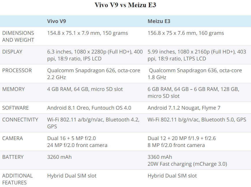 ในสัปดาห์ที่ผ่านมา สมาร์ทโฟน Vivo V9 และ Meizu E3 ได้เปิดตัวทางการในช่วงเวลาไล่เลี่ยกัน และต่างก็เป็นสมาร์ทโฟนระดับกลางทั้งคู่ เว็บไซต์ Gizmochina.com จึงนำทั้งสองรุ่นมาเปรียบเทียบกัน เพื่อหาคำตอบว่า ระหว่าง Vivo V9 กับ Meizu E3 รุ่นไหนจะคุ้มค่าน่าลงทุนที่สุด