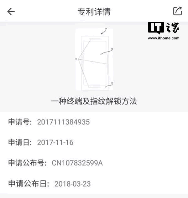 Meizu ได้จดสิทธิบัตรเมื่อเดือนพฤศจิกายน 2017 และเพิ่งได้รับการเผยแพร่เมื่อวันที่ 23 มีนาคมที่ผ่านมา โดยแสดงให้เห็นถึงวิธีการสนแกลายนิ้วมือเพื่อปลดล็อคสมาร์ทโฟนในรูปแบบใหม่ โดยใช้เซ็นเซอร์ Ultrasonic หลายตัว ติดตั้งอยู่ตามขอบจอแสดงผล ไม่ได้ฝังลงบนจอแสดงผลเหมือนกับ Vivo หรือ Huawei