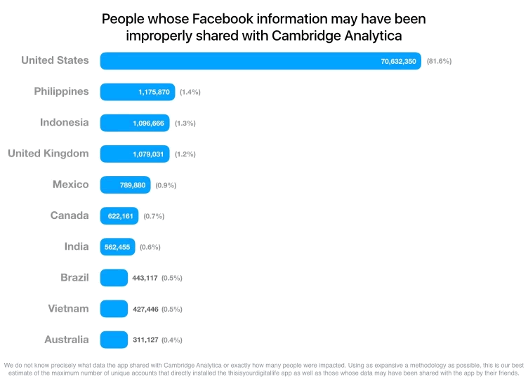 Facebook ได้ออกมายืนยันว่าข้อมูลผู้ใช้งาน Facebook ที่รั่วไหลไปยังบริษัท Cambridge Analytica อาจมีถึง 87 ล้านบัญชี ซึ่งส่วนใหญ่เป็นข้อมูลของผู้ใช้งานในสหรัฐอเมริกา มากกว่า 70 ล้านบัญชี และข่าวดีคือข้อมูลผู้ใช้งานชาวไทย ไม่ได้ถูกรวมอยู่ในแผนภูมิที่ Facebook จัดทำขึ้นมา แสดงว่ามีข้อมูลของคนไทยรั่วไหลออกไปน้อยมาก หรืออาจจะไม่มีเลย