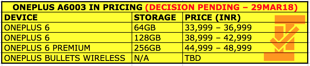 แหล่งข่าวในอินเดีย รายงานว่า OnePlus 6 อาจมีให้เลือก 3 รุ่น ตามหน่วยความจำ ได้แก่ 64GB, 128GB และ 256GB โดยราคาเริ่มต้นจะอยู่ในช่วง 33,999 – 36,999 รูปี หรือราว 16,350 – 17,795 บาท สำหรับเวอร์ชั่น 64GB