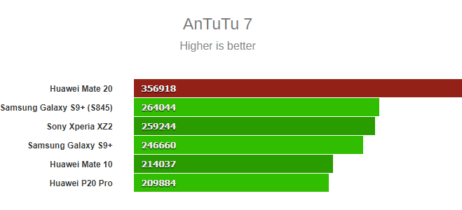 นอกจากนี้ Huawei Mate 20 ยังทำคะแนนสูงกว่า amsung Galaxy S9+ และ Sony Xperia XZ2 ซึ่งทั้งสองรุ่นใช้ชิปประมวลผล Snapdragon 845 ซึ่งเป็นชิปที่ดีที่สุดในปัจจุบันนี้ของ Qualcomm