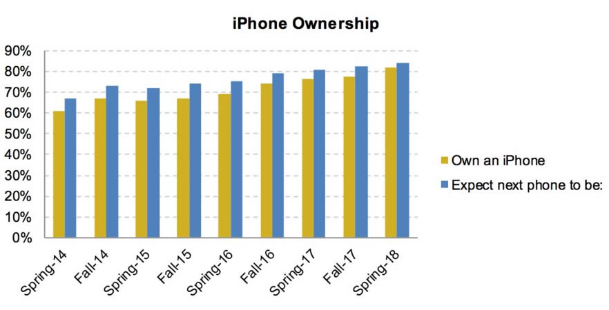 Piper Jaffray เปิดเผยผลสำรวจวัยรุ่นชาวอเมริกันจำนวนหลายพันคน จากทั้งหมด 40 รัฐ ที่มีอายุเฉลี่ย 16 ปี พบว่ามีมากถึง 82% ที่เป็นเจ้าของ iPhone โดยมีอัตราการเติบโตเพิ่มขึ้นจากฤดูใบไม้ร่วงที่ผ่านมา ซึ่งมีสัดส่วนอยู่ที่ 78%