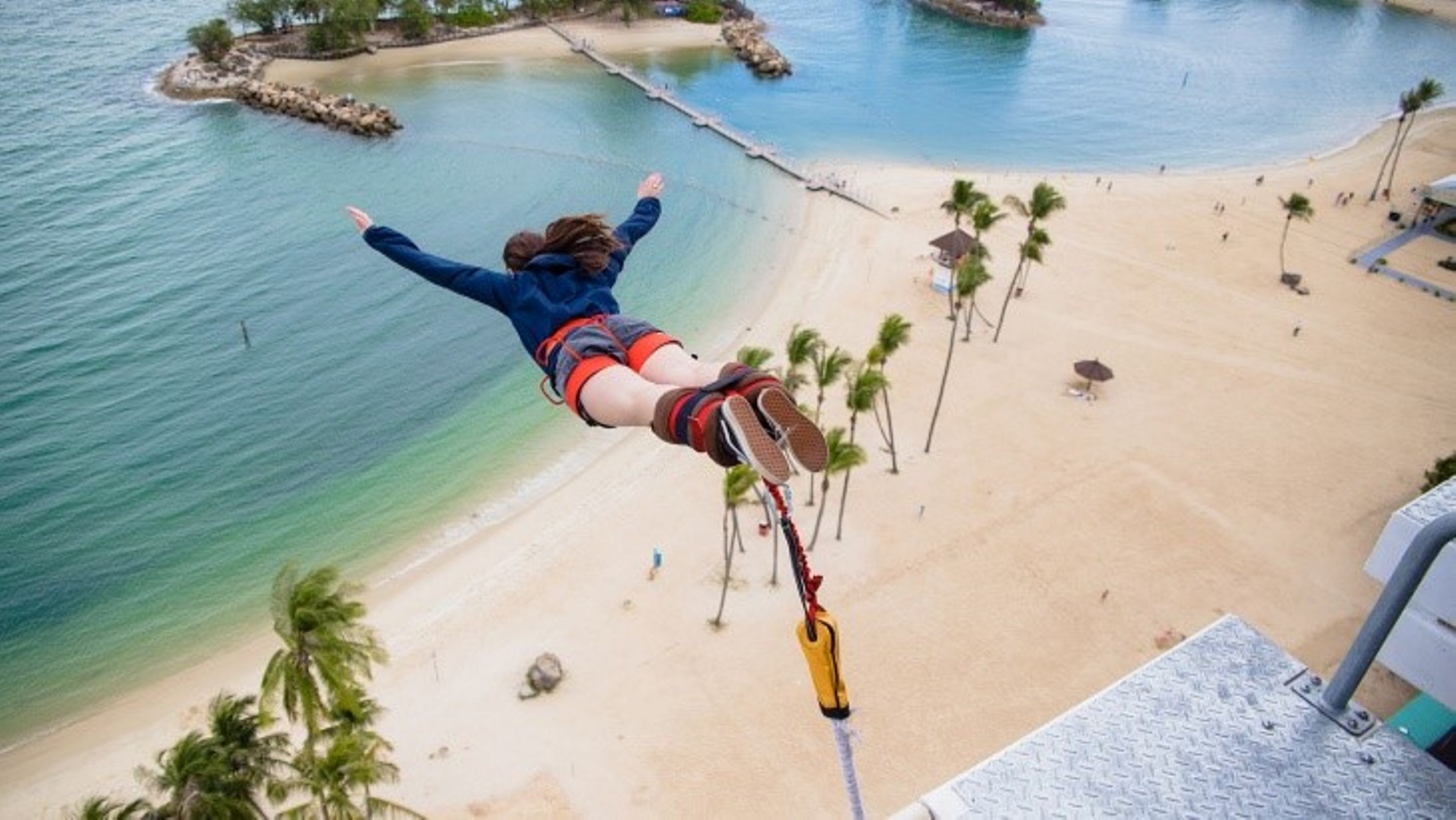 Woman leaping off AJ Hackett bungee, with Sentosa beach backdrop