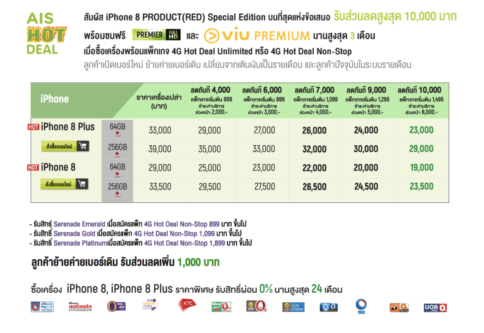 มาถึงข่าวจากค่าย AIS กันบ้างกับการวางจำหน่าย iPhone 8 และ iPhone 8 Plus (PRODUCT)RED Special Edition ในประเทศไทยซึ่งตอนนี้ก็ได้เปิดให้สั่งซื้อล่วงหน้าไปเรียบร้อยแล้วเช่นเดียวกับทาง dtac ตั้งแต่วันนี้ถึง 23 เมษายน 2561 โดยสินค้าเริ่มจัดส่งวันที่ 25 เมษายน 2561 ซึ่งเร็วกว่าทาง dtac ถึง 2 วัน พร้อมโปรโมชั่นลดสูงสุด 10,000 บาทเลยทีเดียว นอกจากนี้ยังมีโปรโมชั่นเครื่องเปล่า สำหรับลูกค้าเอไอเอสรายเดือนอีกด้วย