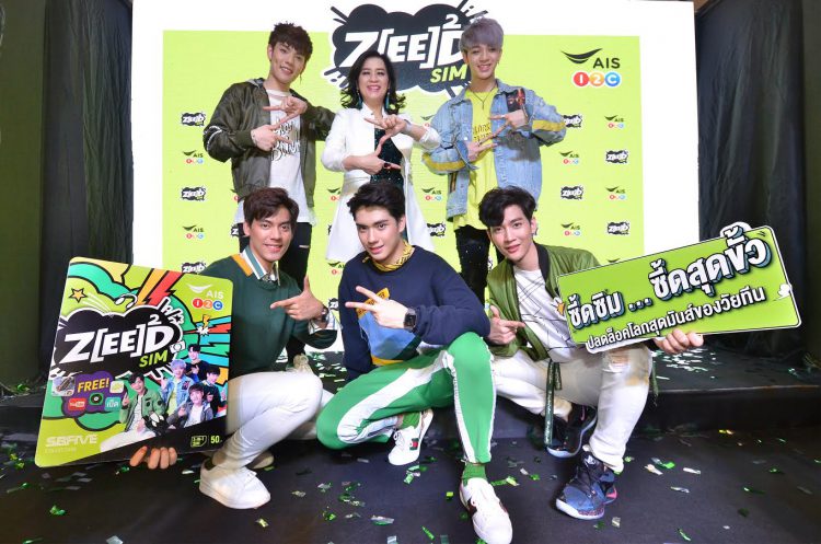 เอไอเอส วัน-ทู-คอล! โดย นายฐิติพงศ์ เขียวไพศาล หัวหน้าฝ่ายงานการตลาด และงานขาย กลุ่มลูกค้าทั่วไป แถลงข่าวเปิดตัว พรีเซ็นเตอร์ใหม่ของแบรนด์ ZEED SIM กับศิลปิน 5 หนุ่มหน้าใส จากวง “SBFIVE” บาส-สุรเดช, คิมม่อน-วโรดม, เต้-ดาวิชญ์, คอปเตอร์-ภานุวัฒน์ และตี๋-ธนพล ดีกรีบอยแบนด์หน้าใหม่ที่ดังไกลระดับเอเชีย จากค่าย LoveIs ที่กำลังเป็นขวัญใจวัยทีนในประเทศไทยและทั่วเอเชีย