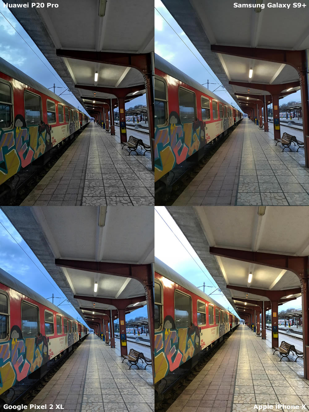 กลับมายังสถานที่เดียวกับภาพแรก นั่นคือ สถานีรถไฟ แต่คราวนี้ท้องฟ้ามืดสนิทแล้ว และ Huawei P20 Pro ไม่ได้รับชัยชนะในภาพนี้ หลังจากนำภาพมาขยายเพื่อดูรายละเอียด ได้ยกให้ Galaxy S9+ และ iPhone X ชนะไปในภาพสุดท้าย