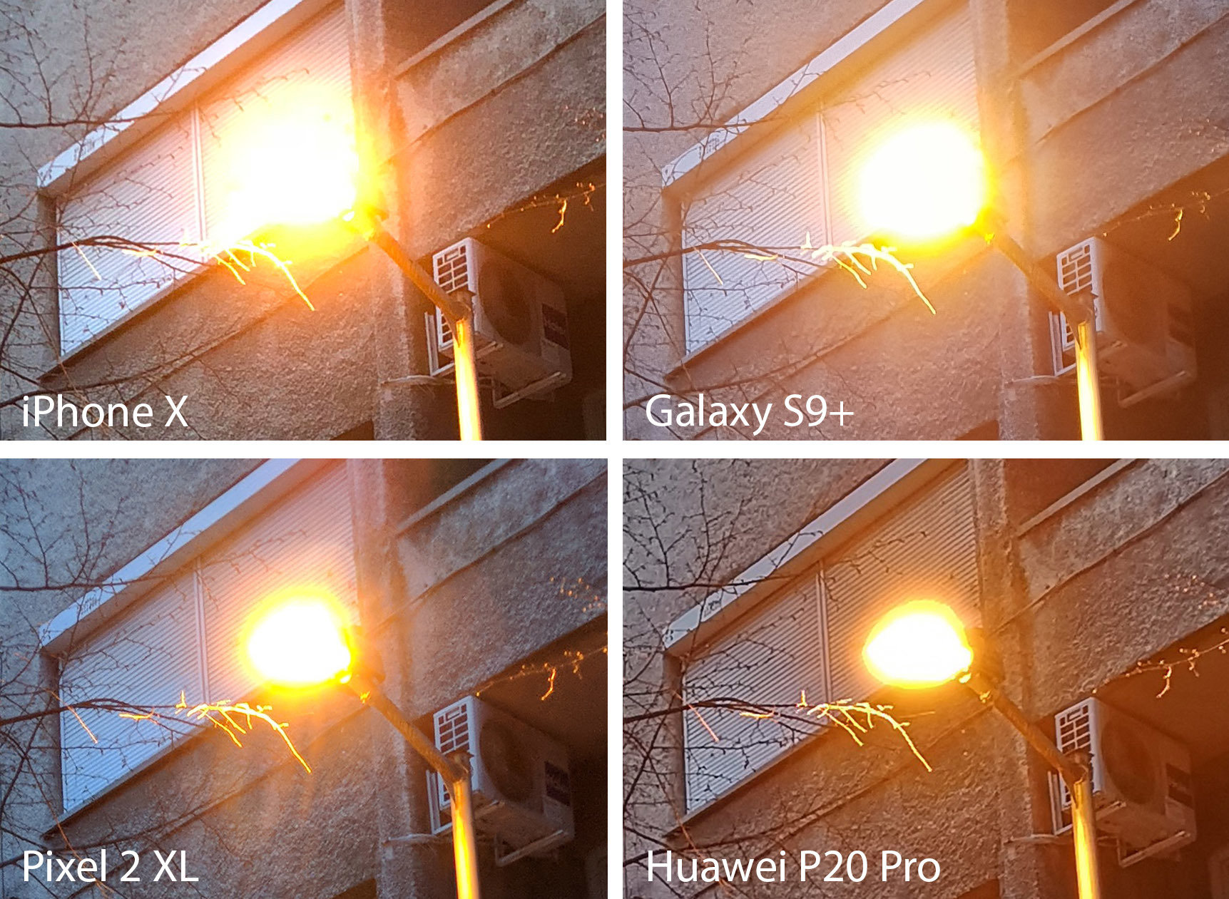 ท้องฟ้าเริ่มเปลี่ยนสีเข้มขึ้น เสาไฟข้างทางเริ่มเปิดสว่างแล้ว ทีมงาน Phonearena จึงเลือกถ่ายภาพที่มีเสาไฟข้างทาง แล้วนำมา crop ในส่วนดวงไฟ ซึ่งพบว่า Huawei P20 Pro ให้ผลลัพธ์ออกมาดีที่สุด