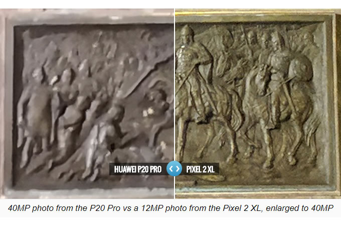 Phonearena ลองปิดโหมดถ่ายภาพกลางคืนของ Huawei P20 Pro และถ่ายด้วยโหมดปกติที่ความละเอียด 40 ล้านพิกเซล แล้วเมื่อนำภาพถ่ายมา crop ก็ได้ผลลัพธ์ที่แย่พอสมควร ขณะที่ภาพถ่ายจาก Pixel 2 XL เพื่อลองนำมาขยายให้มีความละเอียด 40 ล้านพิกเซลเท่ากัน ก็ยังให้รายละเอียดที่ดีกว่า