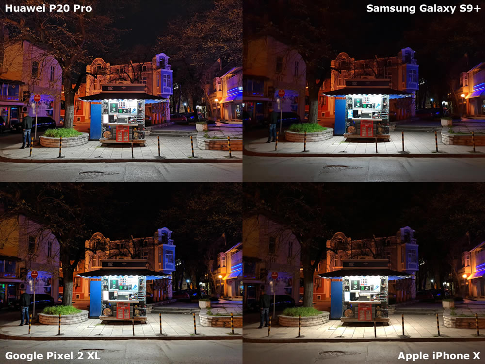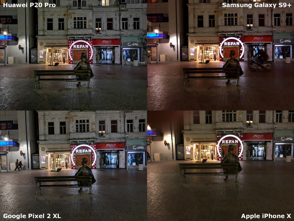 ก่อนจะเลื่อนลงไปดูภาพถ่ายจากสมาร์ทโฟนเรือธงทั้ง 4 รุ่น Phonearena ได้อธิบายการทำงานของกล้อง Huawei P20 Pro เมื่อต้องถ่ายภาพในที่แสงน้อยหรือโหมดกลางคืน โดยบอกว่ากล้องของ P20 Pro จะใช้วิธีการถ่ายภาพหลายช็อตด้วยค่ารับแสงที่แตกต่างกัน ทำให้การถ่ายภาพในโหมดกลางคืนจะใช้เวลาประมาณ 5 วินาที เพื่อให้ซอฟต์แวร์ทำการรวมภาพจากหลายช็อตมาเป็นภาพเดียว และภาพที่ได้จากโหมดกลางคืนยังจำกัดความละเอียดไว้ที่ 10 ล้านพิกเซล