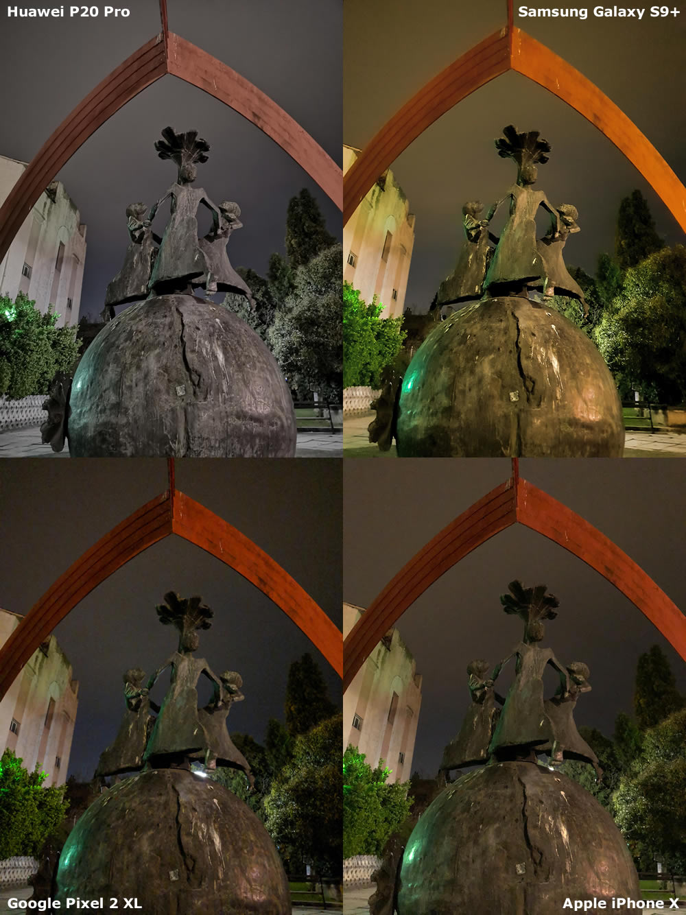ภาพถ่ายงานปฏิมากรรม ที่ฉากหลังเป็นท้องฟ้าสีดำสนิท นี่เป้นงานยากของกล้องสมาร์ทโฟนแต่ Huawei P20 Pro ก็ยังถ่ายออกมาได้ดีที่สุด โดยมีจุดรบกวนต่ำมาก ตามมาด้วย Galaxy S9+, iPhone X และ Pixel 2 XL รั้งท้าย
