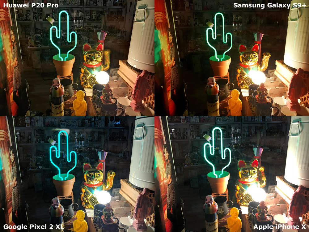 ถ่ายภาพสินค้าที่หลากหลายในร้านค้าแห่งหนึ่ง ซึ่งมีหลอดไฟดวงเล็กกับหลอดนีออน พร้อมตุ๊กตาแมวกวักสีทองที่ทำจากโลหะ Huawei P20 Pro ได้รับชัยชนะอีกครั้งกับภาพนี้ ตามมาด้วย Pixel 2 XL, Galaxy S9+ และคราวนี้เป็น iPhone X ที่อยู่รั้งท้าย