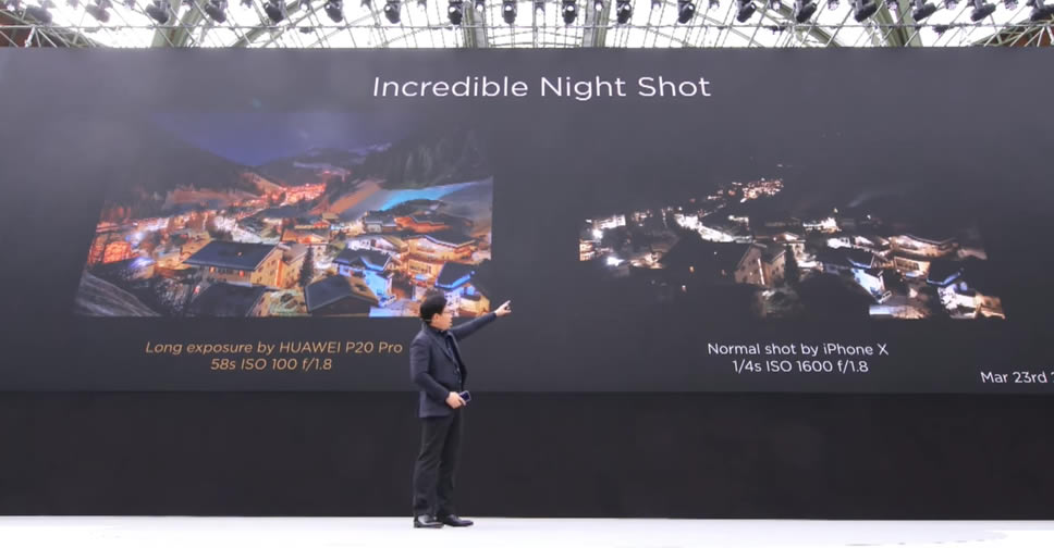 ในงานเปิดตัวสมาร์ทโฟน Huawei P20 Pro เมื่อปลายเดือนมีนาคมที่ผ่านมา Richard Yu ประธานเจ้าหน้าที่บริหาร หัวเว่ย คอนซูมเมอร์ บิสสิเนส กรุ๊ป ได้แสดงให้เห็นว่าระบบกล้อง 3 เลนส์ ของ P20 Pro สามารถถ่ายภาพในที่แสงน้อยได้ดีขนาดไหน โดยเปรียบเทียบกับภาพถ่ายจากสมาร์ทโฟนคู่แข่ง ตามรูปภาพด้านล่าง