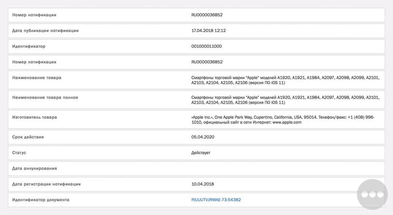 สำหรับ iPhone รุ่นใหม่ ที่ Apple จดทะเบียนกับ EEC ทั้งหมดทำงานบน iOS 11 ใช้รหัสรุ่น A1920, A1921, A1984, A2097, A2098, A2099, A2101, A2103, A2104, A2105 และ A2106 ซึ่งไม่ตรงกับรหัสรุ่นของ iPhone ที่มีอยู่แล้วในตลาด