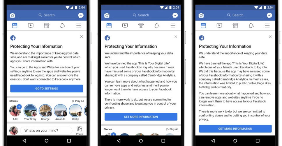 หลังจากข้อมูลผู้ใช้งาน Facebook ถูกแชร์ออกไปยังบริษัท Cambridge Analytica โดยไม่ถูกต้อง ทำให้ Facebook ต้องเพิ่มความปลอดภัยให้กับเจ้าของบัญชี โดยเพิ่มข้อความแจ้งเตือนบน News Feed เพื่อให้ผู้ใช้งานได้ตรวจสอบว่าบัญชีของตัวเอง ถูกละเมิดข้อมูลส่วนตัวหรือไม่