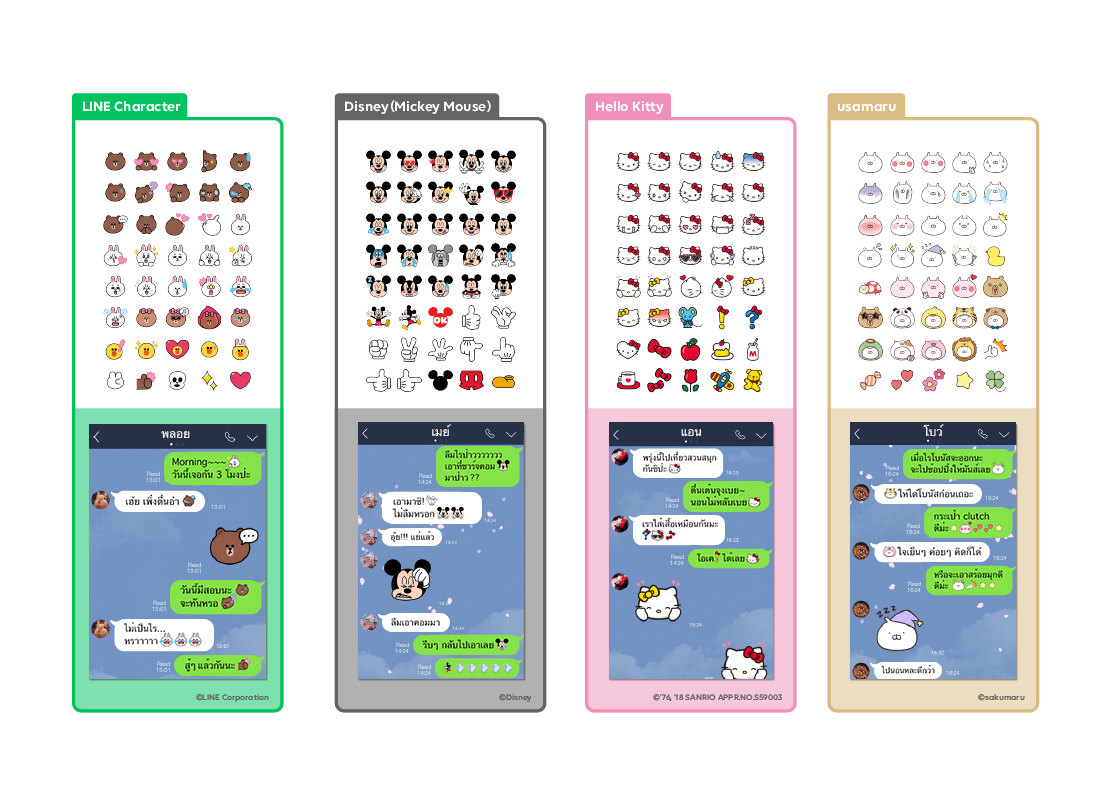 LINE เปิดตัวคาแรคเตอร์ดังกว่า 200 อิโมจิ ไม่ว่าจะเป็นคาแรคเตอร์ LINE อย่าง Brown Choco คาแรคเตอร์ดิสนีย์อย่างมิกกี้เม้าส์ เฮลโล คิตตี้ (Hello Kitty) อุซามารุ (Usamaru) และ กันดั้ม (Gundam) (โดยกันดั้มยังไม่เปิดจำหน่ายในไทย) มาเพิ่มความสดใสให้กับแชทของคุณในครั้งนี้ โดยมีแผนจะเพิ่มคาแรคเตอร์มากขึ้นอย่าง สนู้ปปี้ โดราเอมอน Rilakkuma แรคคูน Rascal อีกด้วย