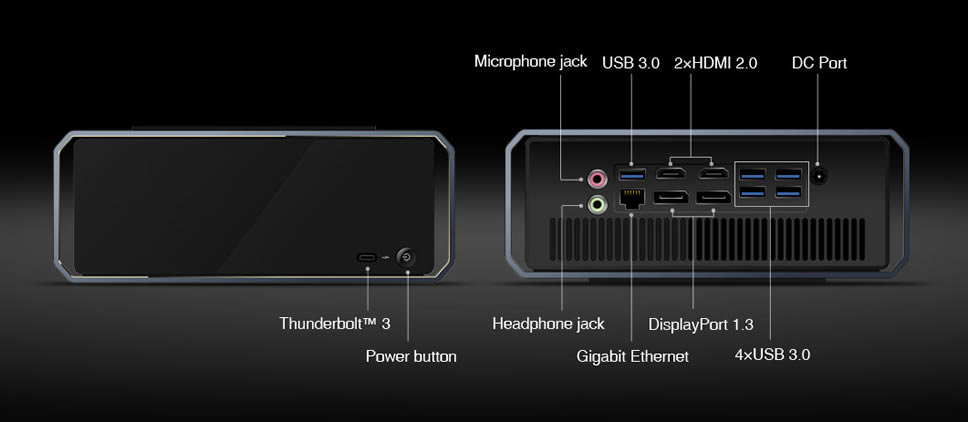 Chuwi HiGame มีขนาดเคสเพียง 173 x 158 x 73 มิลลิเมตร รองรับการเชื่อมต่อ Thunderbolt 3, USB 3.0 (5 ช่อง), HDMI 2.0 (2 ช่อง), DisplayPort 1.3 (2 ช่อง), Ethernet, ช่องเสียบแจ็คหูฟัง, ไมโครโฟน และสนับสนุนการทำงานร่วมกับอุปกรณ์ VR/MR Headset