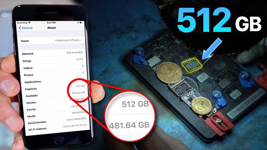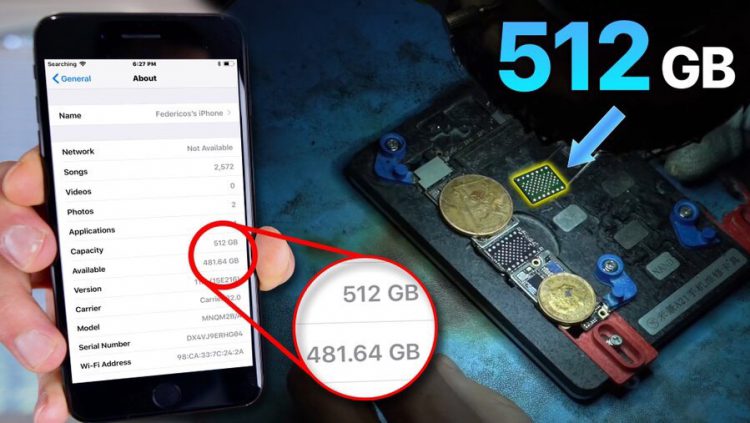 EverythingApplePro สมาชิก YouTube ที่มีผู้ติดตามราว 5.4 ล้านคน ได้รีวิว iPhone 7 Plus รุ่นพิเศษที่มีความจุ 512GB ซึ่งได้รับการอัพเกรดโดย Federico Cerva ในช่วงท้ายของวีดีโอจะแสดงให้เห็นวิธีการอัพเกรดด้วย ซึ่งก็ใช้วิธีการถอดชิปความจำเดิมออกแล้วใส่ชิปความจำใหม่เข้าไปแทน แต่ขั้นตอนก็ซับซ้อนพอสมควร