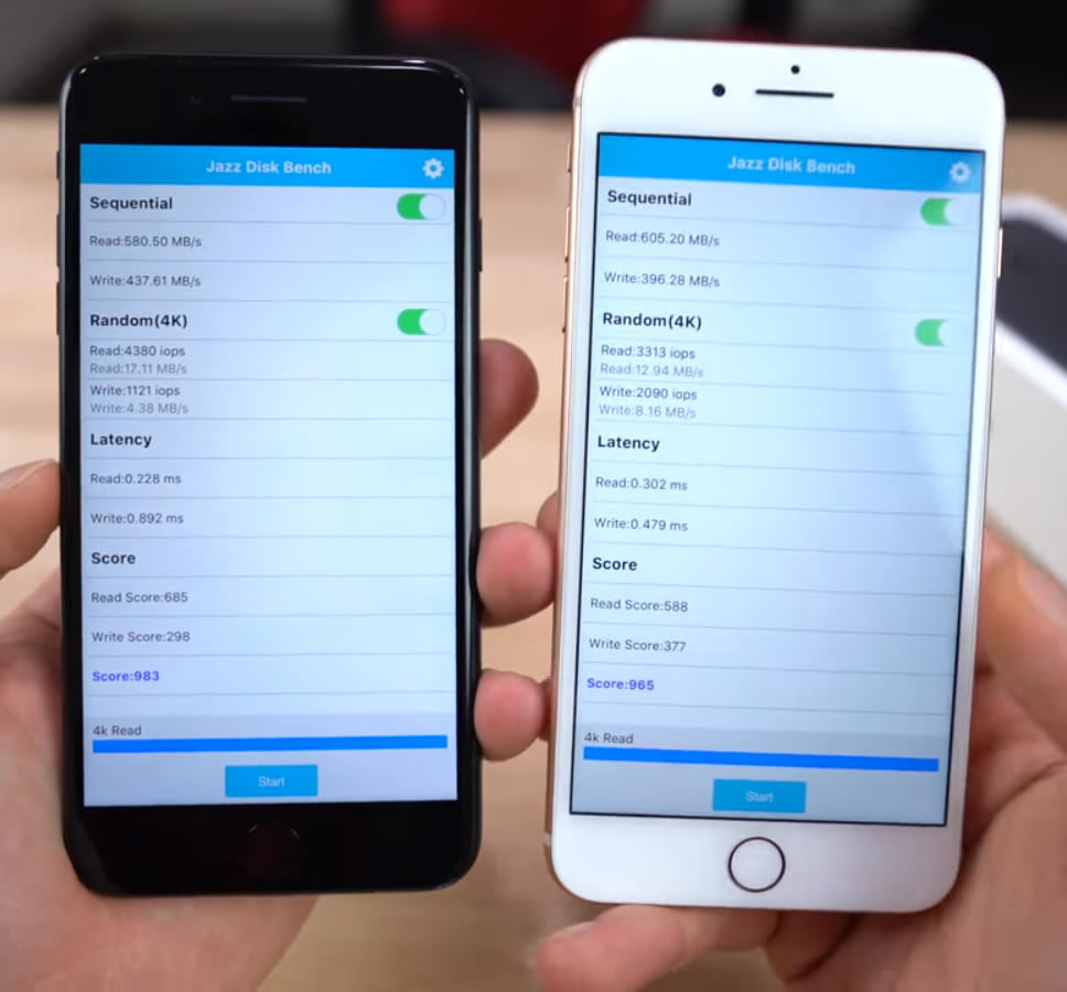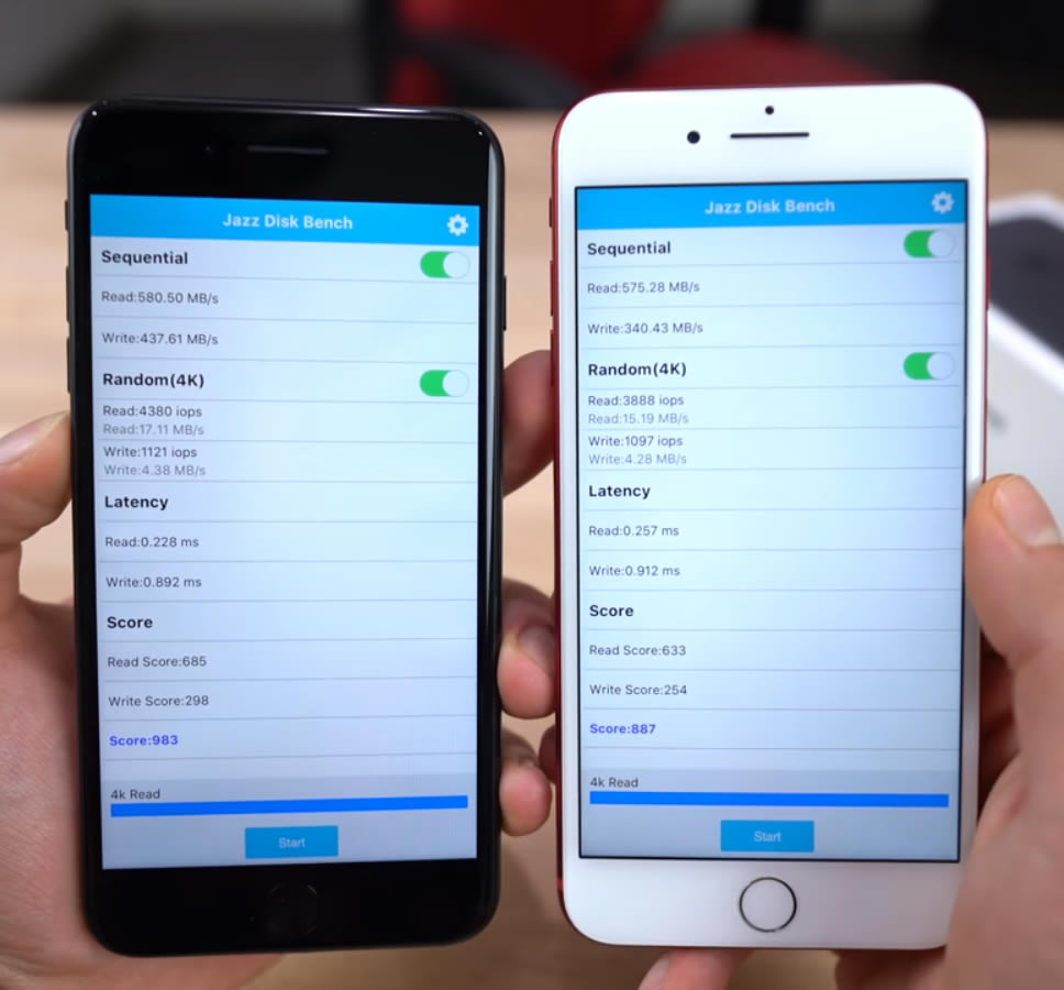 เดิมที iPhone 7 Plus รุ่นนี้มีความจุ 32GB ก่อนถูกอัพเกรดเป็น 512GB และทำงานได้ปกติกับ iOS 11.2.5 เมื่อทดสอบความแอพพลิเคชั่น Jazz Disk Bench ก็สามารถทำคะแนนได้สูงกว่า iPhone 7 Plus และ iPhone 8 Plus รุ่นปกติ ดูผลทดสอบได้จากรูปภาพด้านล่าง