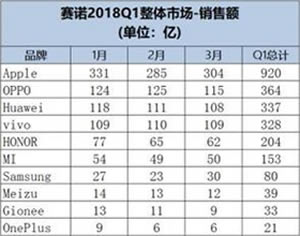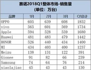 บริษัทวิจัยตลาด Sino รายงานยอดขายสมาร์ทโฟนในประเทศจีน หลังจากผ่าน 3 เดือนแรกของปี 2018 พบว่าแบรนด์ OPPO ขึ้นเป็นผู้นำอันดับ 1 ด้วยยอดขายสมาร์ทโฟน 18.52 ล้านเครื่อง ตามมาด้วย Vivo ยอดขาย 17.34 ล้านเครื่อง Apple อยู่ในอันดับที่ 3 ยอดขาย 16.80 ล้านเครื่อง อันดับที่ 4 เป็นของ Huawei ยอดขาย 14.42 ล้านเครื่อง และอันดับที่ 5 เป็นของ Honor (ซึ่งเป็นแบรนด์ย่อยของ Huawei) มียอดขาย 14 ล้านเครื่อง