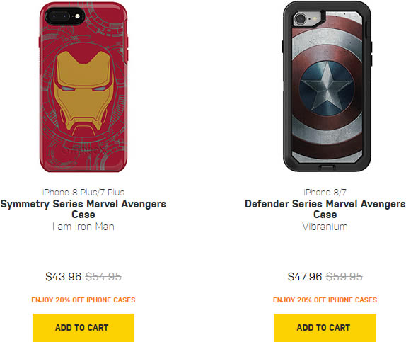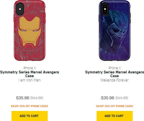 OtterBox เปิดตัวเคสสำหรับ iPhone ภายใต้ธีมภาพยนตร์ Avengers: Infinity War ที่เพิ่งเข้าฉายในโรงภาพยนตร์เมื่อวันที่ 25 เมษายนที่ผ่านมา โดยมีให้เลือกทั้งหมด 5 ลาย ออกแบบตามคาแรคเตอร์ของซูเปอร์ฮีโร่ในจักรวาลของ Marvel ได้แก่ Iron Man, Captain America, Black Panther, Thanos และสุดท้ายคือลาย Assemble (รวมเหล่า Avengers ไว้ในเคสเดียว) ที่น่าสนใจก็คือเคสลาย Iron Man ใช้เส้นสายที่เปล่งแสงได้ในเวลากลางคืน