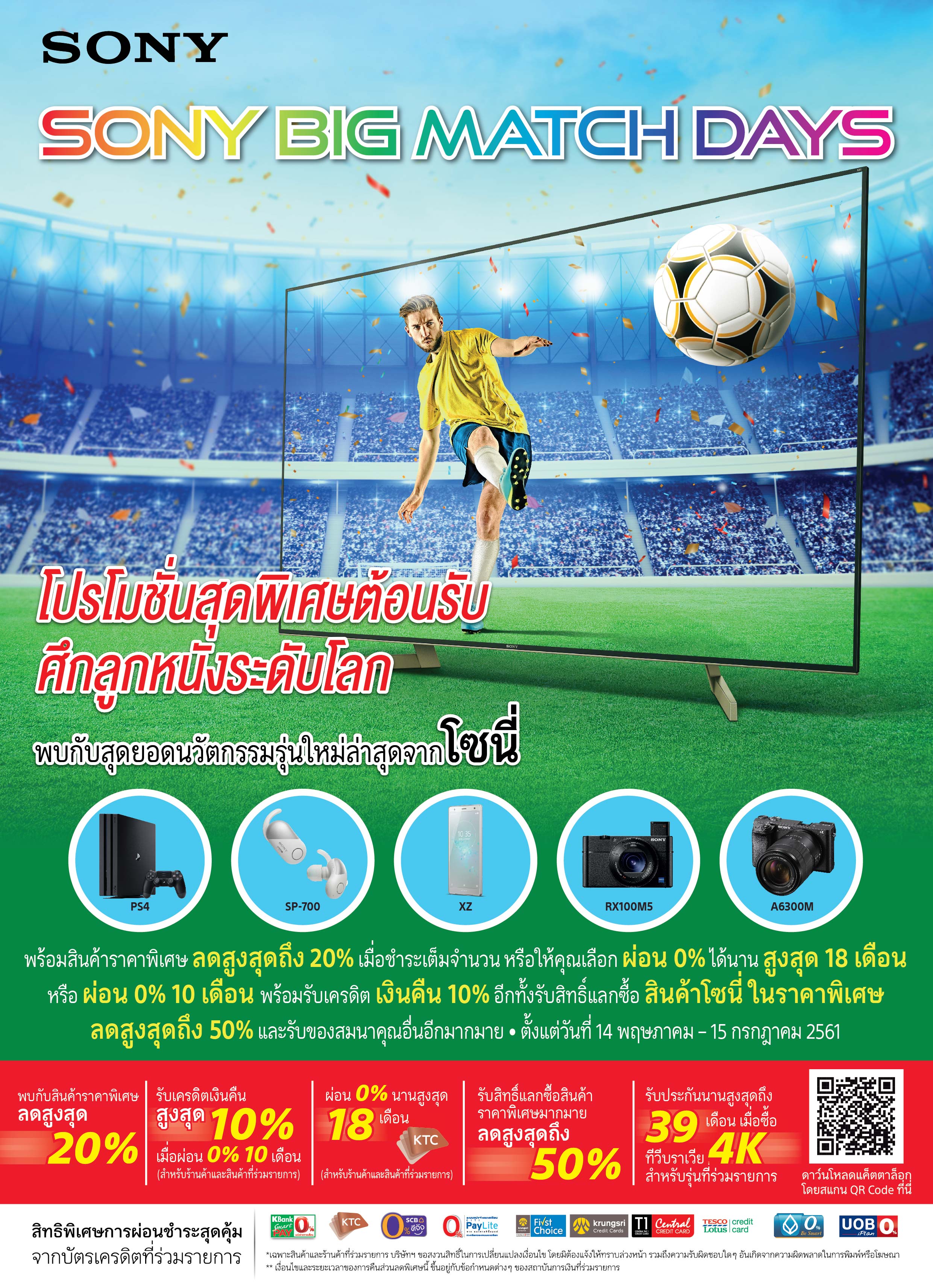 พร้อมกันนี้ โซนี่ไทยยังได้จัดเตรียมแคมเปญพิเศษ “SONY BIG MATCH DAYS” เริ่มตั้งแต่วันที่ 14 พฤษภาคม ถึง 15 กรกฎาคม ศกนี้ ที่ร้านตัวแทนจำหน่ายทั่วประเทศ นับเป็นกิจกรรมโปรโมชั่นสุดคุ้มต้อนรับศึกลูกหนังระดับโลก และเอาใจลูกค้าที่กำลังมองหาทีวีคุณภาพจอใหญ่ เพื่อสัมผัสความบันเทิงสุดอลังการที่แตกต่างกว่าที่เคย คุ้มค่ากับทีวีจอใหญ่ราคาสุดพิเศษ พร้อมรับรับสิทธิ์แลกซื้อสินค้าราคาพิเศษ ลดสูงสุด 50% ผ่อนนานสูงสุด 10 เดือน และยังได้รับสิทธิ์รับประกันสินค้านานสูงสุดถึง 39 เดือน เมื่อซื้อทีวี 4K รุ่นที่ร่วมรายการอีกด้วย