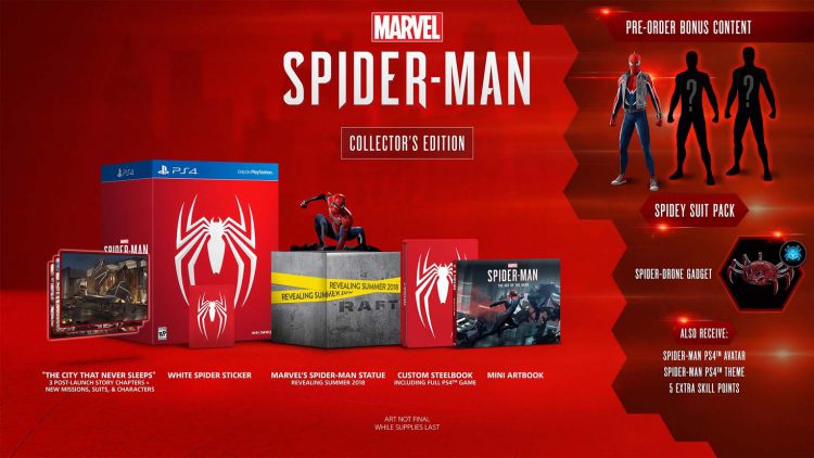 •Custom Steelbook •White Spider Sticker •Mini Artbook – Contains unique, early-look concepts and unreleased artwork •Collector’s Edition Marvel’s Spider-Man Statue by Gentle Giant •Marvel’s Spider-Man: The City that Never Sleeps – consists of three-post launch story chapters featuring new characters and missions. Users will receive DLC by March 2019. |
