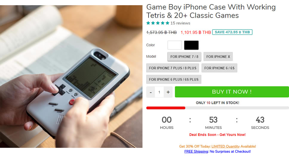 Game Boy iPhone Case มาพร้อมเกมคลาสสิคมากกว่า 20 เกม อย่างเช่น Tetris, Bricks, Tank Battle, Formula One Racing, Snake เป็นต้น วางจำหน่ายผ่านร้านค้าออนไลน์ Chytah.com ราคา 1,574 บาท ปัจจุบันขัดโปรโมชั่นลดเหลือ 1,102 บาท