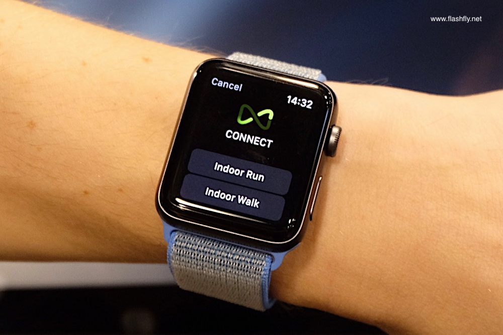 วิธีการเชื่อมต่อก็ง่ายมากแค่เอาหน้าจอ Apple Watch ไปใกล้ตามสัญลักษณ์ดังรูปก็จะเริ่มเชื่อมต่อทันที ที่หน้าจอ Apple Watch ก็จะขึ้นไอคอน Connect สีเขียว สามารถเลือกได้ว่าจะออกกำลังแบบ Indoor Run หรือ Walk เมื่อกดแล้วเป็นอันเรียบร้อย