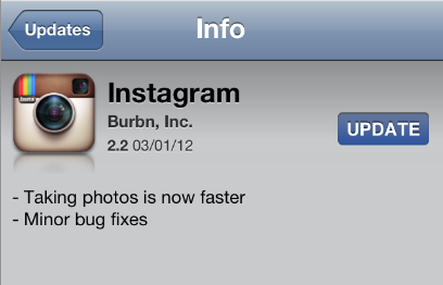 มีมาให้อัพเดทกันอย่างต่อเนื่องกับแอพพลิเคชั่นแต่งภาพยอดนิยม Instagram ที่ไม่ว่าจะเป็น ดารา เซเลบ หรือคนธรรมดาทั่วไปติดกันงอมแงม ในเวอร์ชั่นใหม่นี้ได้มีการปรับปรุงแอพอีกนิดหน่อย โดยจะสามารถถ่ายภาพได้รวดเร็วยิ่งขึ้น พร้อมกับแก้ไขบัคเล็กๆน้อยๆเพิ่มเติม สามารถอัพเดทกันได้แล้วที่ App Store หรือคลิกลิงค์ทางด้านล่างกันได้เลย