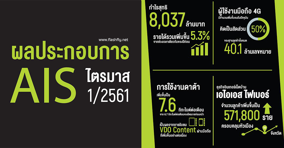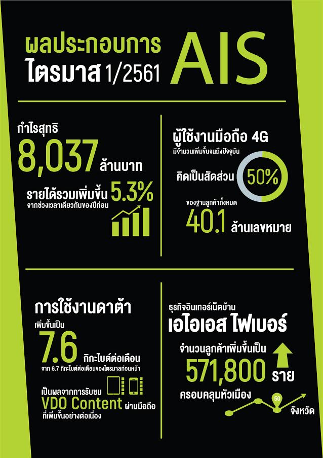 สำหรับภาพรวมในไตรมาส 1/2561 AIS มีรายได้รวมเพิ่มขึ้น 5.3% จากปีก่อน ขณะที่มีรายได้หลักจากการให้บริการเพิ่มขึ้น 6.5% จากปีก่อน และ 2.5% จากไตรมาสก่อน จากทั้งบริการโทรศัพท์เคลื่อนที่ และธุรกิจอินเทอร์เน็ตบ้าน AIS Fibre โดยมีผู้ใช้งานมือถือ 4G คิดเป็นสัดส่วน 50% ของฐานลูกค้าทั้งหมด 40.1 ล้านเลขหมาย การใช้งานดาต้าเพิ่มขึ้นเป็น 7.6กิกะไบต์ต่อเดือน จาก 6.7 กิกะไบต์ต่อเดือนในไตรมาสก่อนหน้า เป็นผลมาจากความนิยมในการรับชมวิดีโอคอนเทนต์ผ่านโทรศัพท์มือถืออย่างต่อเนื่อง สำหรับธุรกิจอินเทอร์เน็ตบ้านAIS Fibre ได้เน้นการขยายฐานลูกค้าในพื้นที่ตัวเมือง 50 จังหวัด และมีฐานลูกค้าเพิ่มขึ้นเป็น 571,800 ราย ขณะที่รายได้จาก AIS Fibre เพิ่มขึ้นต่อเนื่อง 85% จากปีก่อนและ 6.0% จากไตรมาสก่อน สำหรับดิจิทัลคอนเทนต์ นอกจากพรีเมียมคอนเทนต์และฟรีทีวีกว่า 100 ช่องแล้ว AIS ได้เพิ่มช่องใหม่ ได้แก่ ช่อง CNN และช่อง Cartoon Network เพื่อส่งมอบประสบการณ์ความบันเทิงและข่าวสารรอบโลกได้ตลอด 24 ชั่วโมงผ่านแอป AIS PLAY บนมือถือ และ AIS PLAYBOX ทางทีวี ทั้งนี้ จากการควบคุมต้นทุนและรายได้ที่เพิ่มขึ้นส่งผลให้กำไรสุทธิปรับตัวเพิ่มขึ้น 4.5% จากทั้งปีก่อนและ 4.4% จากไตรมาสก่อนอยู่ที่ 8,037 ล้านบาท