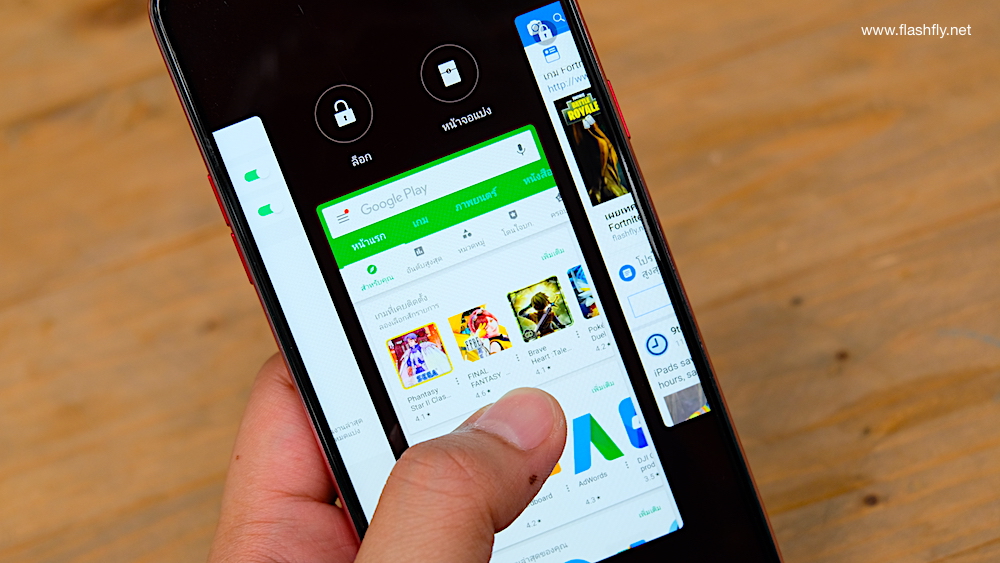 โดยระหว่างที่กำลังดูคลิปหรือเล่นเกมบนหน้าจอแนวนอนอยู่เรายังสามารถใช้งานแอพด่วนได้ 3 แอพได้แก่ SMS, LINE และ FaceBook Messenger ได้ในเวลาเดียวกันด้วยฟีเจอร์ Full Screen Multitasking ซึ่งการเรียกใช้งานง่ายๆด้วยการปัดนิ้วจากขอบจอฝั่งซ้ายเข้ามา ก็จะเห็นไอค่อนแอพด่วนที่รองรับการใช้งานแบบ Pop Up ส่วนด้านล่างเป็นฟั่งชั่นด่วนได้แก่ อัดวิดีโอบนหน้าจอ จับภาพหน้าจอ และปิดการแจ้งเตือน ซึ่งด้วยฟีเจอร์นี้ทำให้สามารถดูซีรีย์เรื่องโปรดได้อย่างต่อเนื่อง ไม่ต้องมาสะดุดกับการเปิด หรือเปลี่ยนสลับแอพพลิเคชั่นไปมานั่นเอง ใครอยากดูคลิปไปด้วยคุยแชทเม้าท์กับเพื่อนด้วยเรื่องคลิป ก็ทำได้สบายไปเลย