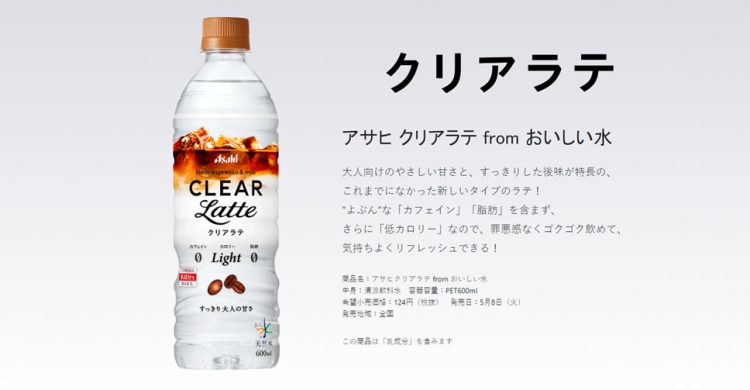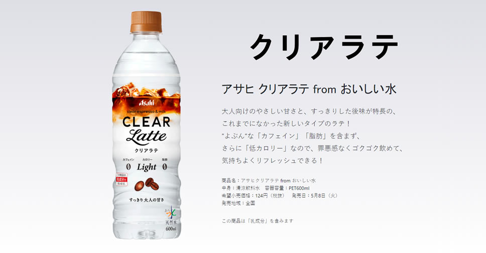 Asahi Soft Drinks บริษัทผลิตเครื่องดื่มในประเทศญี่ปุ่น เปิดตัวน้ำดื่ม Clear Latte ซึ่งมีกลิ่นของกาแฟลาเต้ในน้ำใสบริสุทธิ์ พร้อมยืนยันว่าน้ำดื่ม Clear Latte ปราศจากคาเฟอีน ไร้ไขมัน และมีแคลอรี่ต่ำ ซึ่งบริษัท Asahi เคยผลิตน้ำดื่มที่มีรสชาติของโยเกิร์ตมาแล้วเมื่อไม่กี่ปีก่อนหน้านี้ ดังนั้น ชาวญี่ปุ่นอาจจะไม่แปลกใจหากได้เห็นน้ำดื่มกลิ่นลาเต้