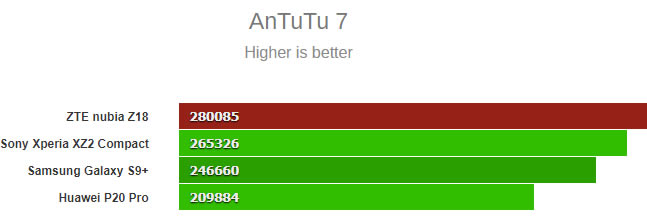 ข้อมูลจาก AnTuTu ระบุว่า Nubia Z18 ทำได้ 280,085 คะแนน สูงกว่า Sony Xperia XZ2 Compact, Samsung Galaxy S9+ และ Huawei P20 Pro