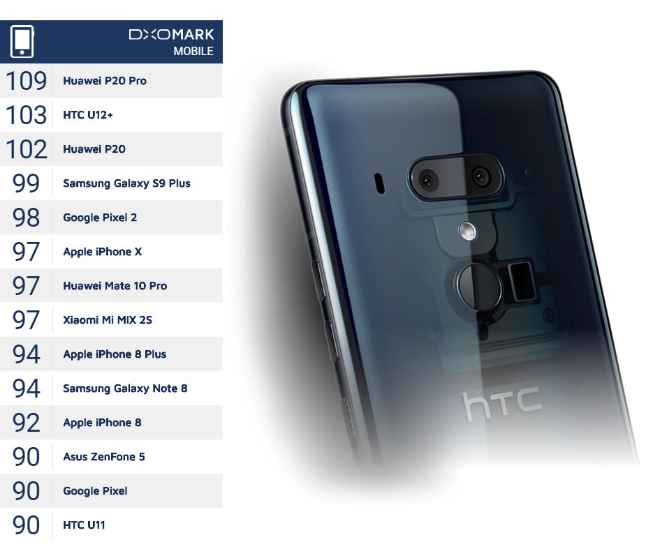 ย้อนกลับไปเมื่อปีที่แล้ว HTC U11 เคยเป็นสมาร์ทโฟนที่ทำคะแนนได้สูงที่สุดจากการทดสอบของ DxOMark ก่อนจะถูกเรือธงรุ่นใหม่ๆ ที่ออกมาทีหลังทำคะแนนแซงหน้า และในปีนี้ HTC U12+ พร้อมกลับมาทวงบัลลังก์คืนแล้ว โดยทำคะแนนได้สูงถึง 103 คะแนน จากรุ่นก่อนที่ทำได้ 90 คะแนน แต่ก็ยังไม่เพียงพอที่จะแซง Huawei P20 Pro