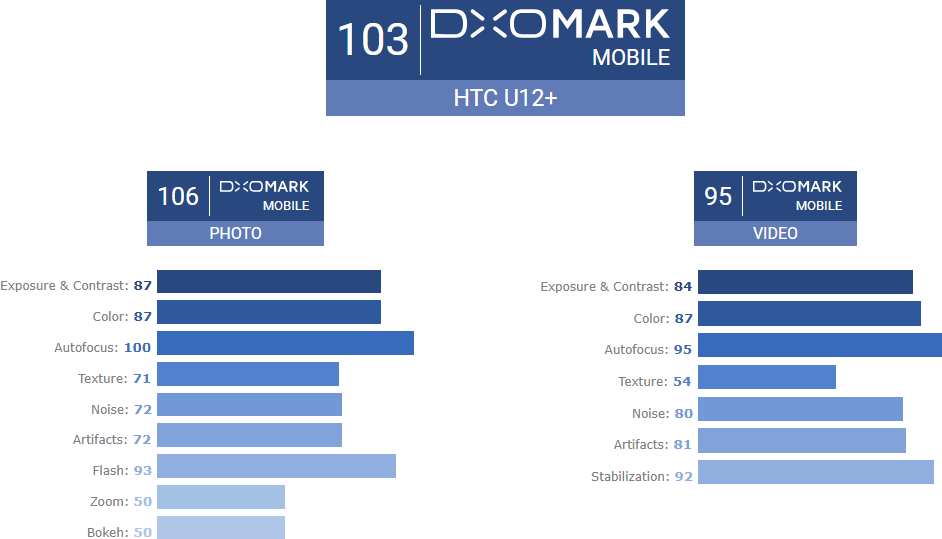 จากคะแนนรวม 103 คะแนน DxOMark ได้จำแนกเป็น 106 คะแนนสำหรับการถ่ายภาพนิ่ง และ 95 คะแนนสำหรับการถ่ายวีดีโอ ในส่วนของการถ่ายภาพนิ่ง DxOMark บอกว่า HTC U12+ มีระบบออโต้โฟกัสที่แม่นยำและรวดเร็ว สมดุลสีขาวมีความถูกต้องให้สีสันที่น่าพอใจ การเปิดรับแสงแม่นยำและให้ช่วงไดนามิคกว้าง เก็บรายละเอียดพื้นผิวได้ดี และให้เอฟเฟ็กต์ Bokeh เป็นธรรมชาติ แต่ยังมีจุดรบกวนเมื่อถ่ายภาพในที่แสงน้อย รายละเอียดในการซูมภาพจากระยะกลางและระยะไกลยังทำได้ไม่ดี โดยเฉพาะการถ่ายภาพในอาคารและในที่แสงน้อย