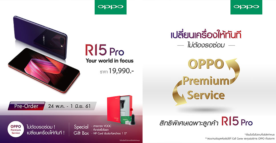 ทั้งนี้ เพื่อให้มั่นใจว่าได้มอบประสบการณ์ที่ดีที่สุดให้แก่ผู้ใช้ทุกๆ ท่าน OPPO จึงได้เปิดตัวบริการหลังการขายสุดพิเศษ OPPO Premium Service ที่กล้ารับประกันว่าเหนือชั้นกว่าใครๆ แน่นอน เอกสิทธิ์สำหรับเฉพาะผู้เป็นเจ้าของสมาร์ทโฟนเรือธงรุ่นใหม่ล่าสุด OPPO R15 Pro เท่านั้น หากพบเครื่องมีปัญหาจากผลิต เปลี่ยนเครื่องทันที ไม่ต้องซ่อมให้เสียเวลาอีกต่อไป!