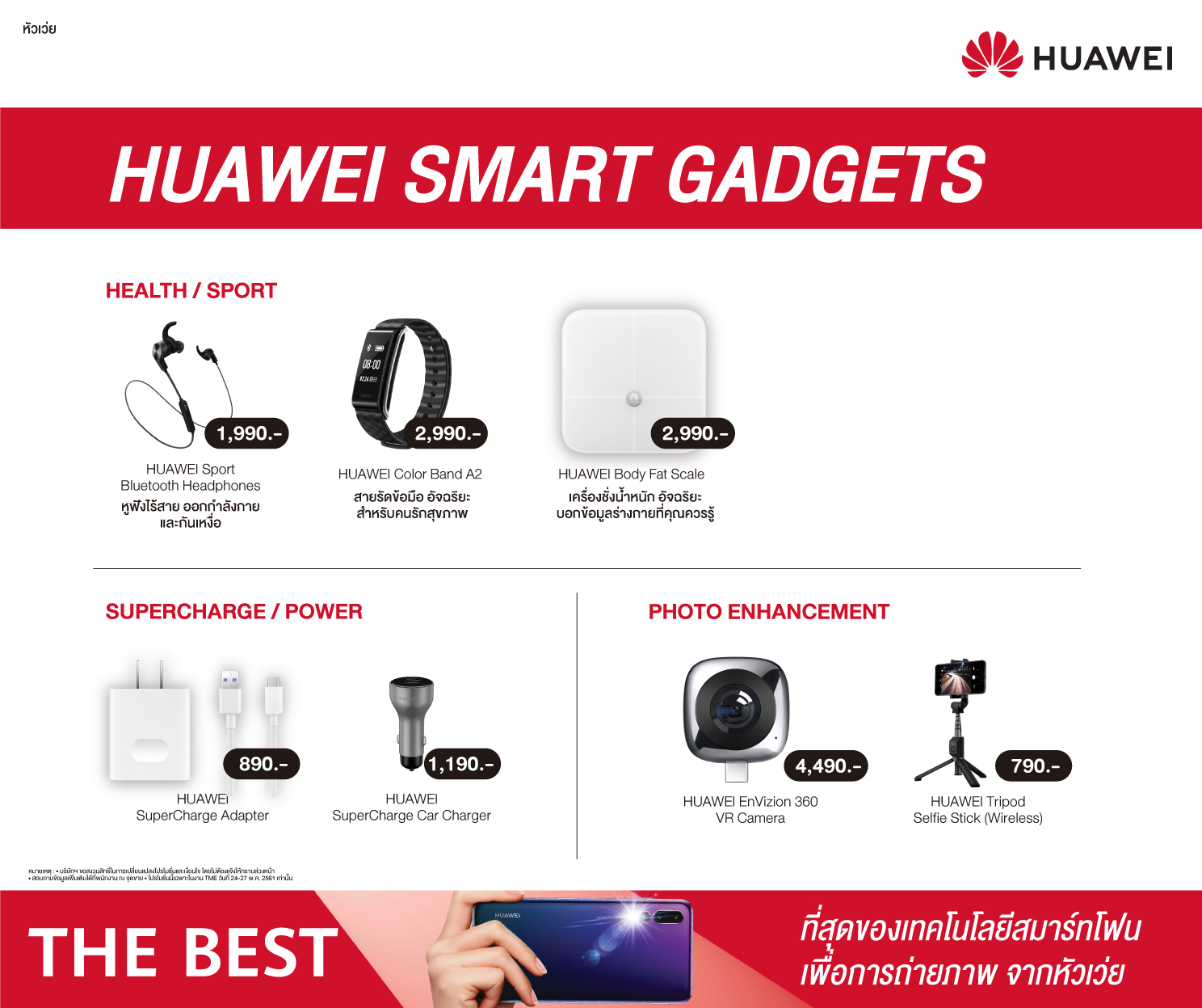ยกระดับการใช้ชีวิตด้วยนวัตกรรมจาก Smart Gadget พบสินค้าในหมวดหมู่ Health, Sport และ Photo อาทิHUAWEI Sport Bluetooth Headphones หูฟังสำหรับออกกำลังกายแบบไร้สายและกันเหงื่อ ราคา 1,990 บาทHUAWEI Color Band A2 สายรัดข้อมืออัจฉริยะ ราคา 2,990 บาท และ HUAWEI Body Fat Scale เครื่องชั่งน้ำหนักอัจฉริยะ ราคา 2,990 บาท ผลิตภัณฑ์ในกลุ่ม Charger และ Power อาทิ HUAWEI SuperCharge Adapter ราคา890 บาท และ HUAWEI SuperCharge Car Charger ราคา 1,190 บาท และพบกับผลิตภัณฑ์ในหมวดหมู่ Photo Enhancement อย่าง HUAWEI EnVizion360 VR Camera ราคา 4,490 บาท และ HUAWEI Tripod Selfie Stickแบบ Wireless ราคา 790