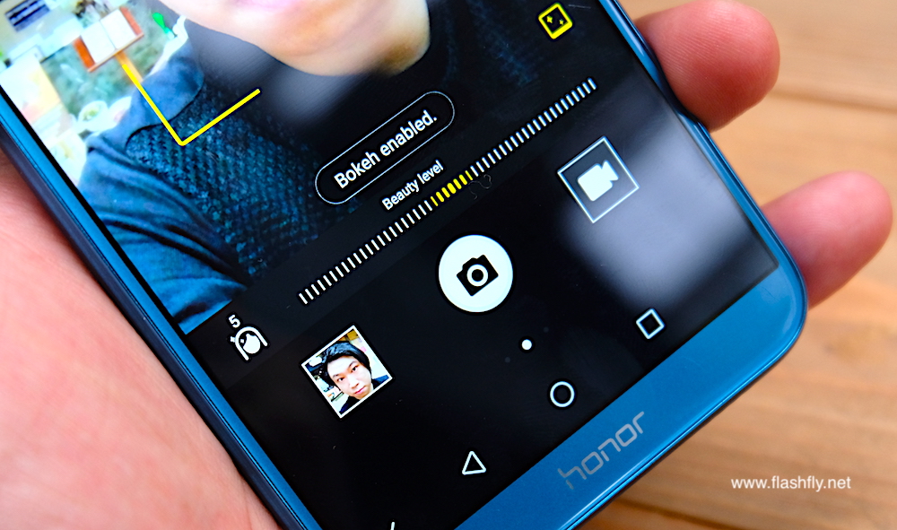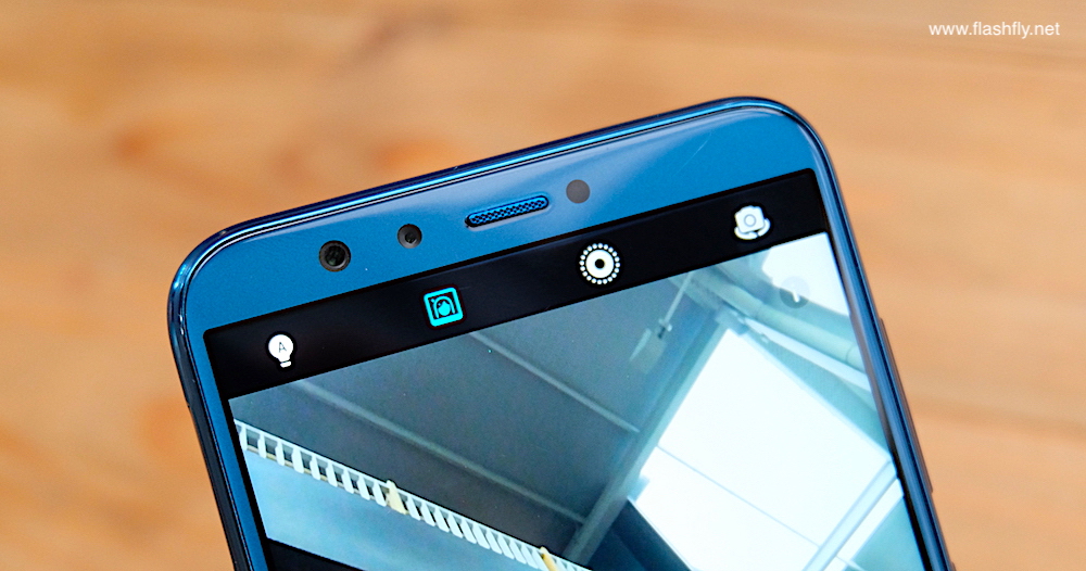 เหนือจอแสดงผลจะพบกับกล้องคู่เซลฟี่ 13 + 2 ล้านพิกเซล ถ่ายภาพหน้าชัดหลังเบลอด้วยโหมด Bokeh และรองรับฟีเจอร์ปลดล็อคด้วยการสแกนใบหน้า ข้างลำโพงหูฟังยังฝังหลอดไฟแจ้งเตือนเอาไว้ด้วย