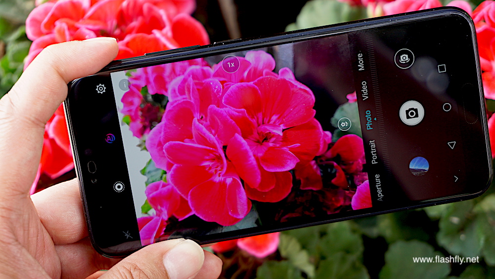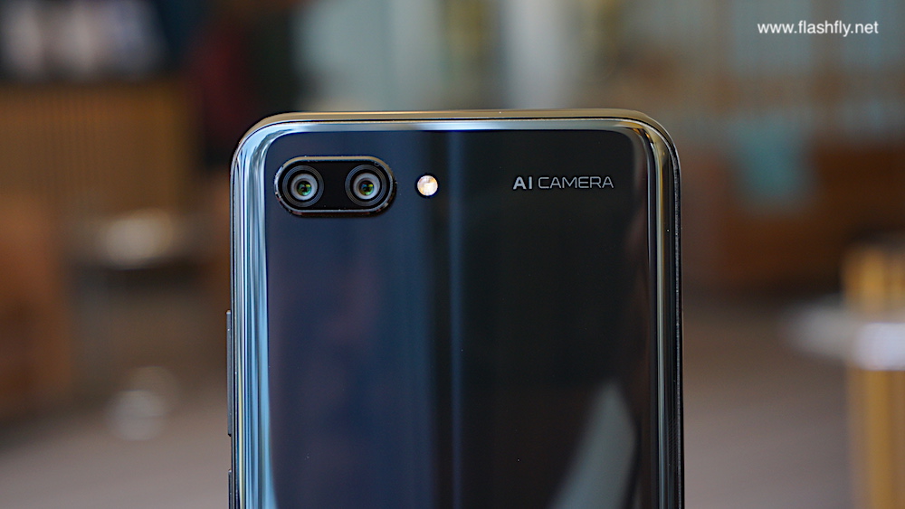 ด้านหลังมีกล้องคู่ความละเอียด 24 ล้านพิกเซลกับ 16 ล้านพิกเซล ถัดมาจะเป็นไฟแฟลช พร้อมระชัดเจนว่ารุ่นนี้มี AI Camera