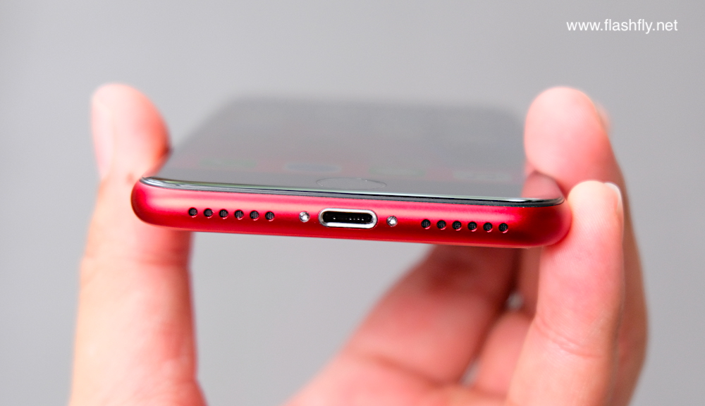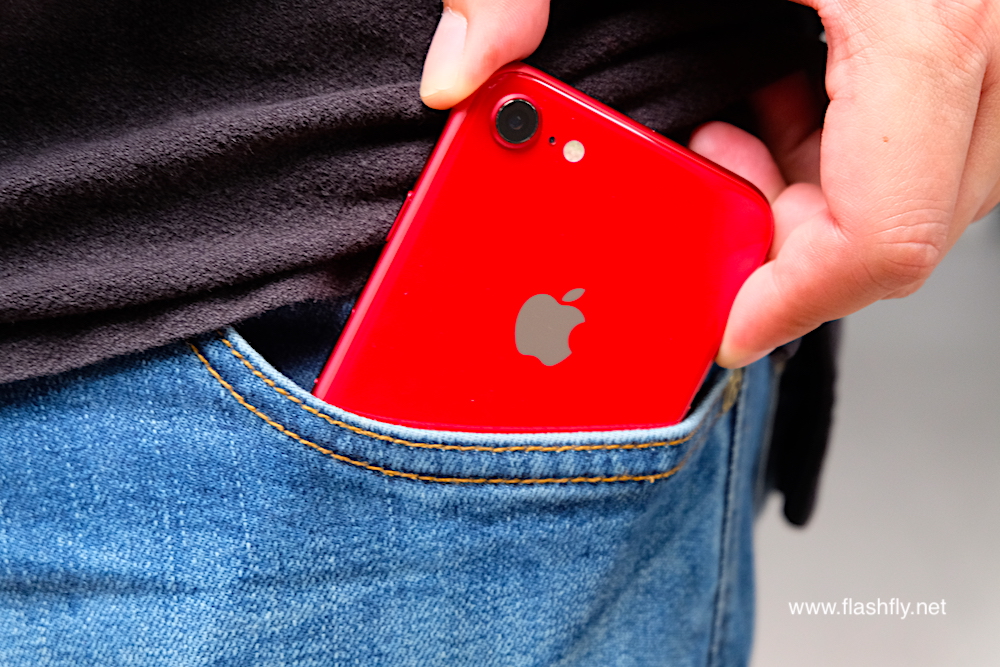 ด้านหลังเป็นกระจกสีแดงสด ตัดกับโลโก้ Apple สีเงินเงางาม