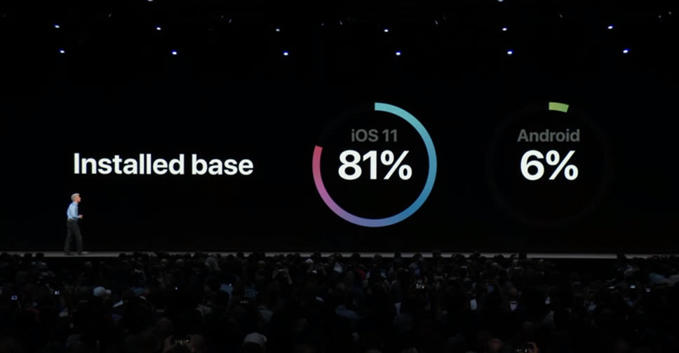 Craig Federighi รองประธานอาวุโสฝ่ายวิศวกรรมซอฟต์แวร์ของ Apple ได้ชี้ให้เห็นว่า ระบบปฏิบัติการ iOS 11 ได้รับการยอมรับจากเจ้าของอุปกรณ์ iOS จนถูกติดตั้งไปแล้วถึง 81% จากจำนวนอุปกรณ์ iOS ทั่วโลก พร้อมเปรียบเทียบกับ Android Oreo ซึ่งเป็นเวอร์ชั่นล่าสุด ถูกติดตั้งไปเพียง 6% เท่านั้น