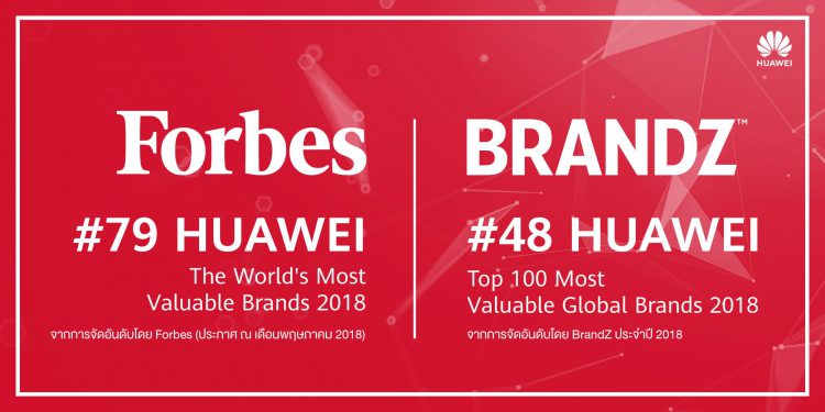หัวเว่ยไต่ขึ้นสู่อันดับที่ 79 แบรนด์ที่มีมูลค่าสูงสุดในโลกปี 2018 โดย Forbes และเป็นบริษัทจากประเทศจีนเพียงหนึ่งเดียวที่มีชื่อในการจัดอันดับเป็นปีที่ 2 ติดต่อกัน โดยหัวเว่ยมีมูลค่าแบรนด์ตามการจัดอันดับอยู่ที่ 8.4 พันล้านเหรียญสหรัฐฯ นอกจากนี้ยังไต่ขึ้นสู่อันดับที่ 48 ใน 100 แบรนด์ที่มีมูลค่าสูงที่สุดในโลกตามรายงาน BrandZ ™ โดยมีมูลค่าแบรนด์เพิ่มสูงขึ้น 22% ในปีที่ผ่านมา